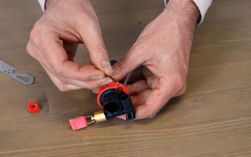 The control valve is secured with a so-called brass 'stop nut'. You loosen the stop nut with the supplied MSR tool. To take the control valve apart, first loosen the stop nut a few turns (always counterclockwise) and then the control valve itself a few turns.